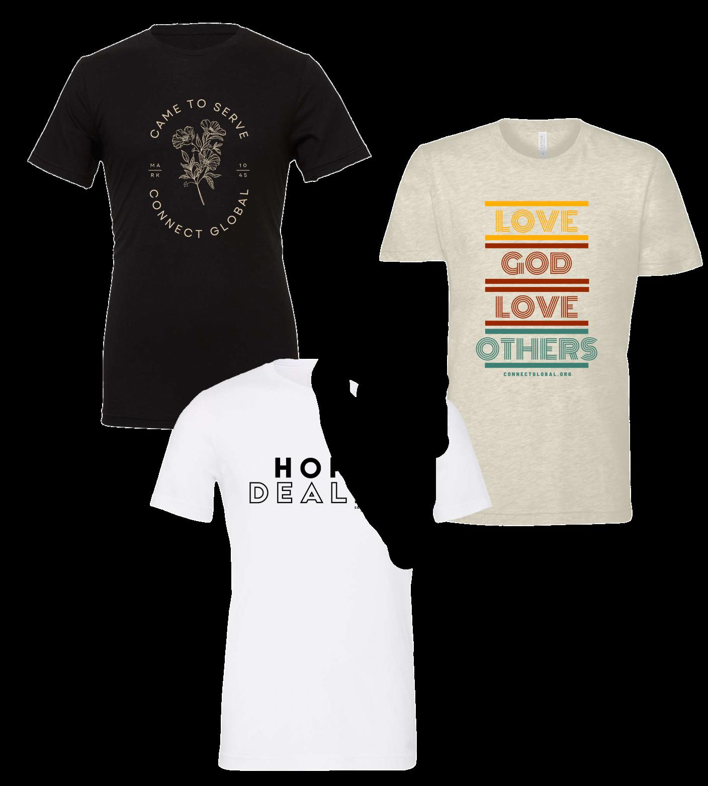Make a new donation to Connect Global of $25 or more this month and we will send you one of the T-shirts below Be sure to designate your size and preference of shirt