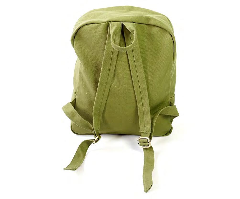 TerraThreadZemMiniBackpackismadeusingheavy-duty14ozorganic cottoncanvas.Thebestbackpacksforeverydayuseandtheenvironment! Itfeaturesoutsideandinsidepocketstoorganiseyourthings. FairtradeOrganicCotton|GOTSCertified CarbonNeutral|FairTradeFactory •Longzipperdouble-sidedpulls •Largefrontpocketwithzipper •Insidehangingpocket •YKK lead free antique finish metal zippers •Dimensions:13"(H)x10.5"(W)x4"(D)