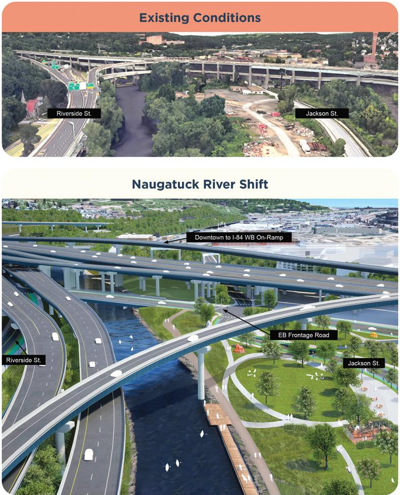 The second alternative is known as the Naugatuck River Shift and would move the river toward the east to provide space for unstacking the series of Conn. 8 ramps and bridges.