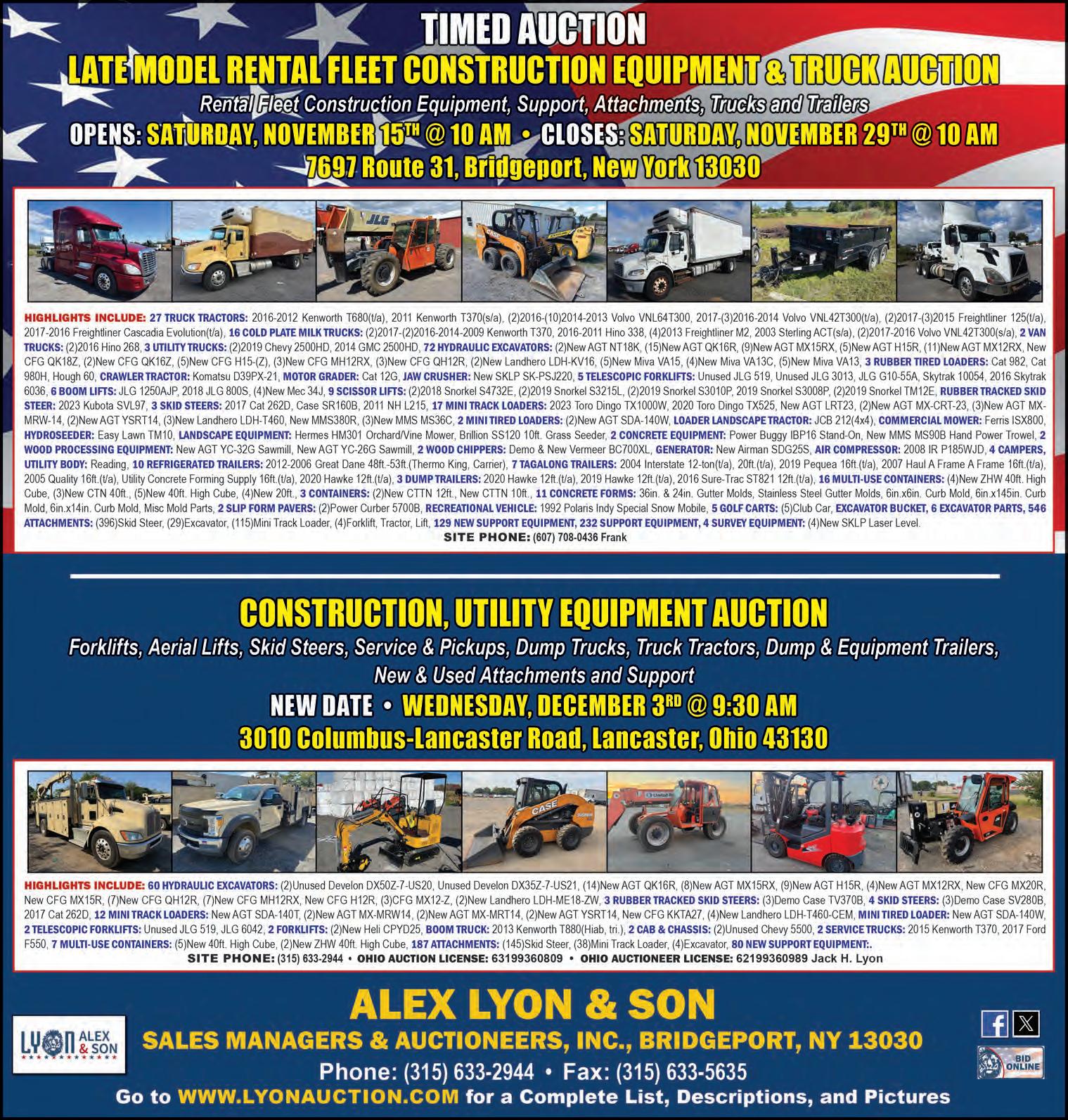 15. NEW DATE- LIVE: Friday, December 5: RICHMONDVILLE, NEW YORK: Major, Major Job Completion. Late Model Construction Equipment, Aerial Lifts, Forklifts, All Types of Trucks and Trailers, Large Quantity Support Equipment (It's Good).