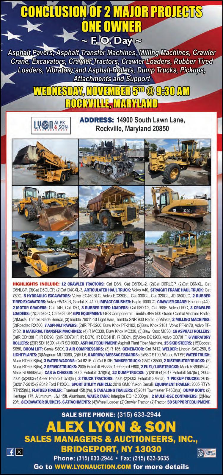 7. LIVE: Wednesday, November 5: ROCKVILLE, MARYLAND: Several Job Completions at the Same Time. HIGHLIGHTS: (10)Asphalt Pavers, (8)Asphalt Transfer Machines, (2)Milling Machines, Crawler Crane, (5)Excavators, (10)Crawler Tractors, (2)Crawler Loaders, (3)Rubber Tired Loaders, Cat 769C Rock Truck, (3)Cat 621B, (5)Vibratory & (15)Asphalt Rollers, (2)Distributor Trucks, (2)Pull Discs, (6)Message Boards, (12)Bobcat Skid Steers, Light Plants, SPECIAL: Approx. (20)Late Model Kenworth Dump Trucks(tri.), (2)Peterbilt Lowboy Truck Tractors, Mechanics Truck, Lowboy Trailer, (25)Pickups, Plus Attachments, Support and Parts, Pickups, Attachments and Support.