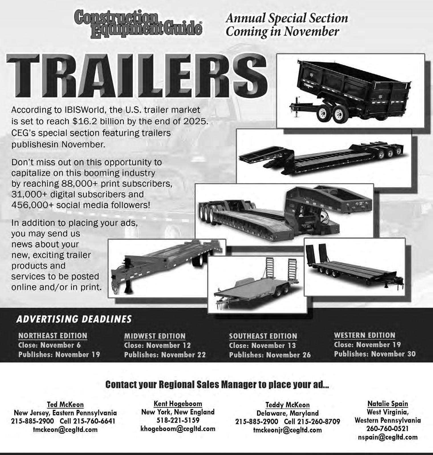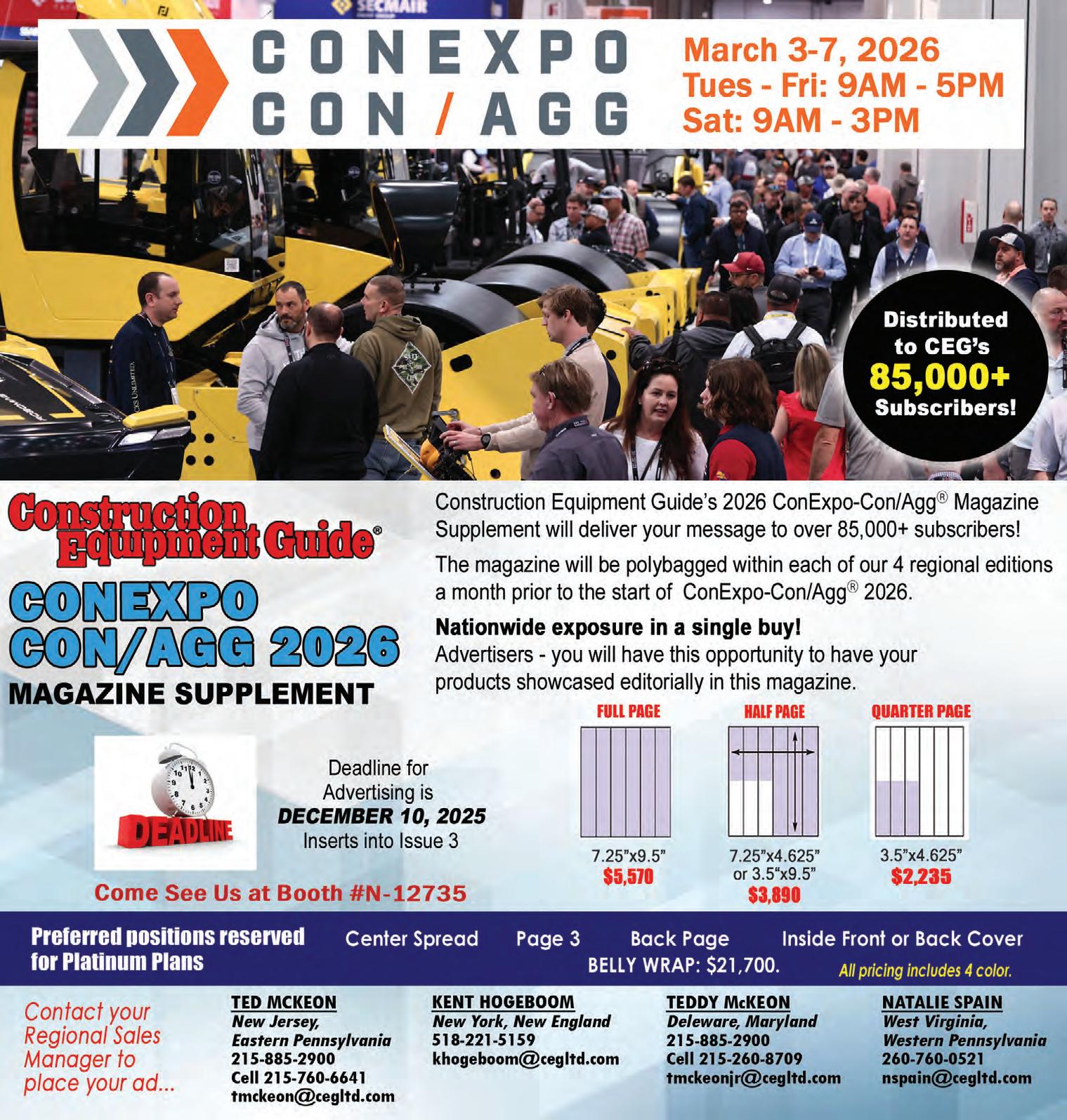 NORTHEAST EDITION; Publication Number: 1058-787X; Date of filing: Sept. 19, 2025; Frequency: Bi-weekly, 26 issues annually; Annual Subscription price: $65.00; Complete mailing address of known office of publication: 470 Maryland Dr., Ft. Washington, PA 19034; Publisher’s general business office: 470 Maryland Dr., Ft. Washington, PA 19034; Publisher’s name and address: Edwin M. McKeon, Jr. 470 Maryland Dr., Ft. Washington, PA 19034; Editor in Chief: Craig Mongeau, 470 Maryland Dr., Ft. Washington, PA 19034; Owner: CONSTRUCTION EQUIPMENT GUIDE NORTHEAST EDITION, 470 Maryland Dr., Ft. Washington, PA 19034; Edwin M. McKeon Jr., 470 Maryland Dr., Ft. Washington, PA 19034; Joseph McKeon, 5875 N. Lincoln Ave. Suite 227, Chicago, IL 60659; Richard McKeon, 3307 Indian Meadows Ln, Charlotte, N.C. 28210; Known bondholders, mortgages, and other security holders: None, Issue date for circulation data below 09/24/25; Extent of circulation (Average number of copies during preceding 12 months): Net press run 20,164; paid circulation through agents 2,400; through mail subscription 17,682; free distribution 0; total distribution 20,082; copies not distributed 82; return from news agents 0; electronic copies 182; Total 20,346; Percent Paid and/or Requested Circulation 100%; Actual number of copies for issue published nearest to filing date: Net press run 21,516; paid circulation through agents, 2,400; through mail subscription, 19,032; free distribution, 0; total distribution, 21,432; copies not distributed, 84; return from news agents, 0; electronic copies 158; Total 21,674; Percent Paid and/or Requested Circulation 100%.