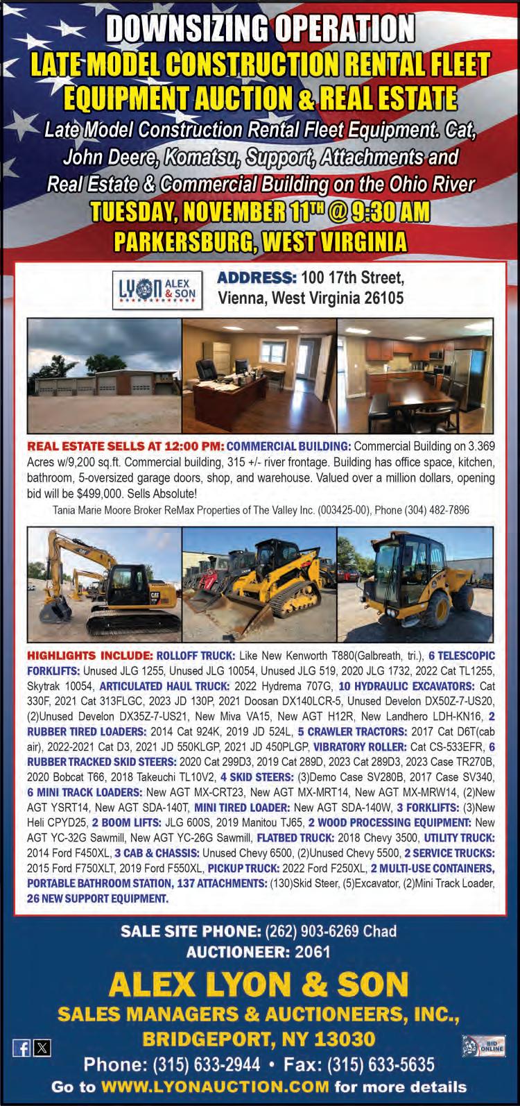 9. LIVE: Tuesday, November 11: PARKERSBURG, WEST VIRGINIA: Very Late Model Cat, John Deere Construction Rental Fleet Equipment. Cat, John Deere, Komatsu, Support, Attachments and SPECIAL 8 Acres of Real Estate on the Ohio River.