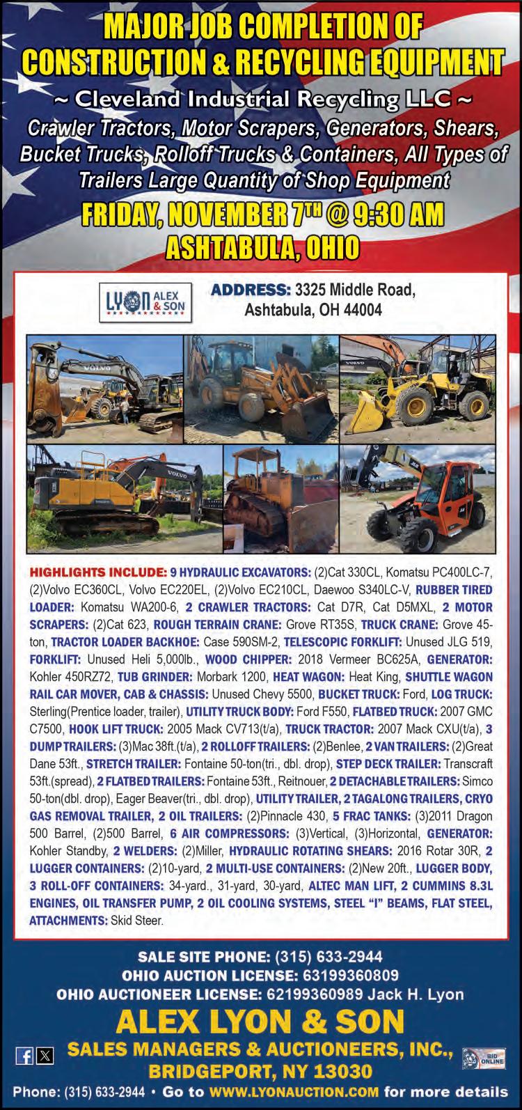 8. LIVE: Friday, November 7: ASHTUBULA, OHIO: Major Job Completion of Construction & Demolition Equipment. Cat D7R, Cat D5G, (2)Cat 623B, 500Kw Generator, Shears, Bucket Trucks, Rolloff Trucks & Containers, All Types of Trailers Large Quantity of Shop Equipment.