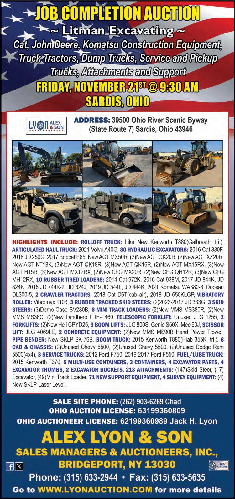 11. LIVE: Friday, November 21: SARDIS, OHIO: Job Completion of Cat, John Deere, Komatsu Construction Equipment, Truck Tractors, Dump Trucks, Service and Pickup Trucks, Attachments and Support.