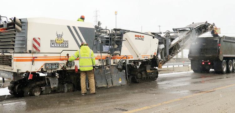 Heavy equipment on the project includes a 130-ton crawler crane; 80-ton crawler cranes; various excavators; asphalt mills; cement stabilization equipment; dozers; graders; and an asphalt paver.