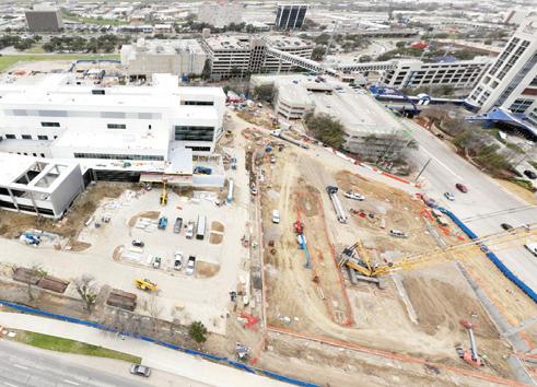 “Permanent power has been activated by Oncor,” said Hummel. “Boilers have been started up, and warm air is blowing in the building. Installation of building finishes including flooring, millwork, doors and interior glass and is progressing at various stages in the patient towers. A mockup patient room is complete, and courtyard paving and site paving are progressing.”