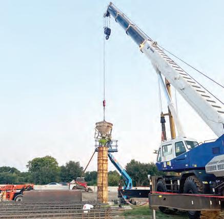 Workers use a 70ton rough-terrrain crane to help with the pouring of the first column of the project on the northbound ramp at Stewart Road Bridge.