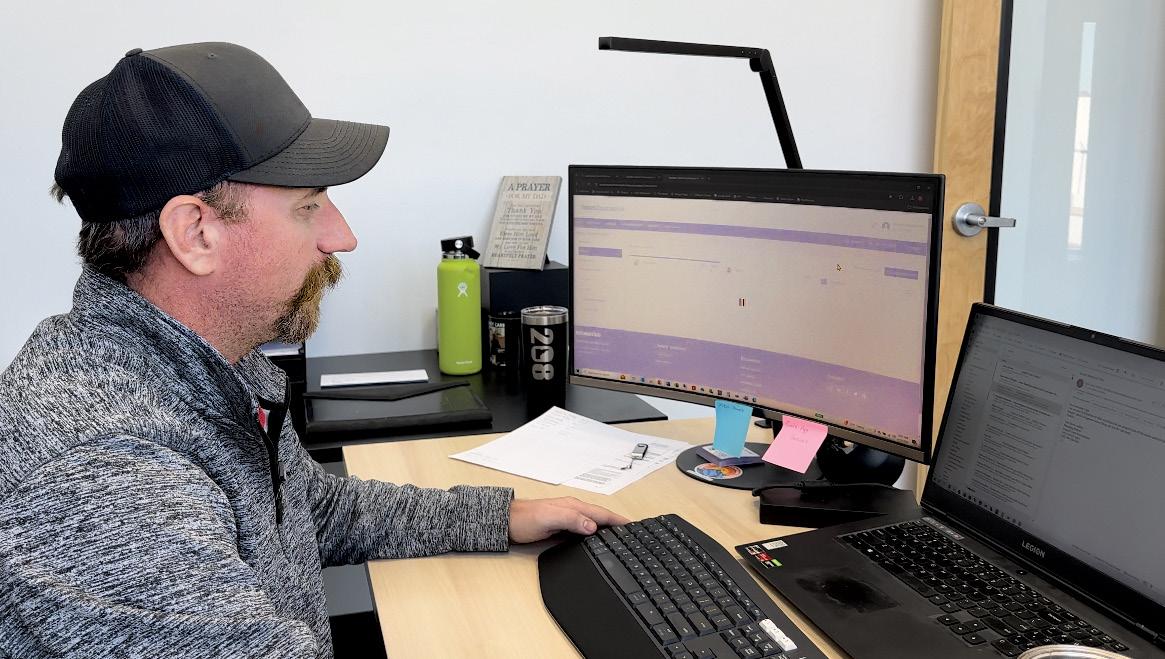 Burks Excavation Corporation of Idaho General Manager Cody Allison uses Komatsu’s Smart Construction Remote to send plan updates to the company’s Komatsu Intelligent Machine Control (IMC) equipment from his office.