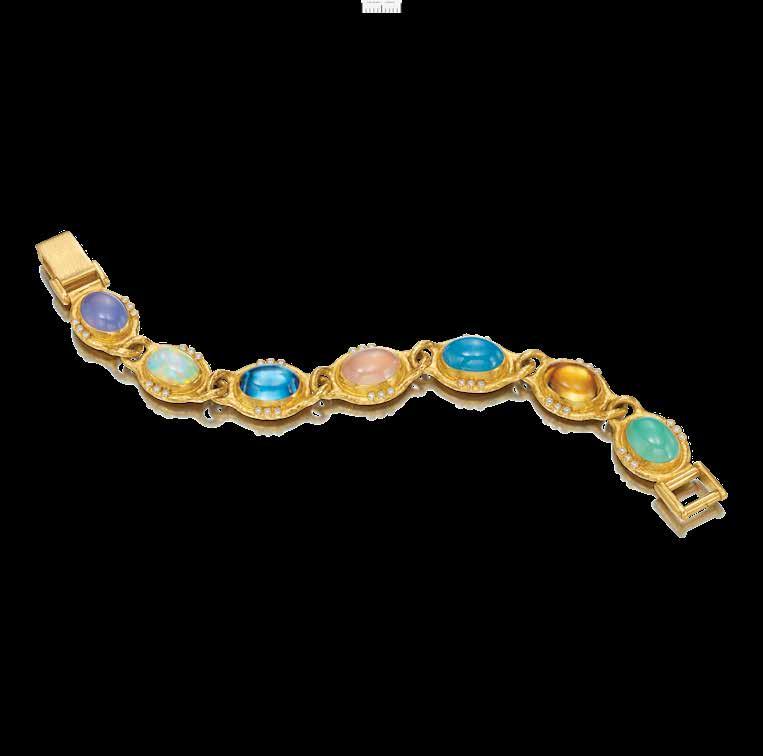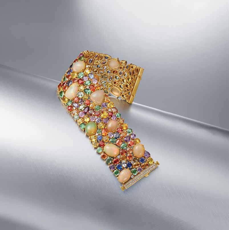 On the front cover: Intricate multi-colored sapphire, diamond, and Ethiopian opal bracelet. Price on request.