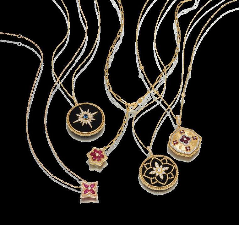 Left to right: Ruby and diamond pendant, $2,400. Black onyx, sapphire and diamond pendant, $2,250. Ruby and diamond pendant, $2,450. Black onyx and diamond pendant, $2,250. Ruby and diamond pendant, $2,900.