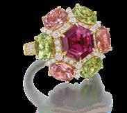 Peridot, black onyx and diamond ring, $5,400. Multi-colored cabochon tourmaline and diamond bracelet, $28,725. 57