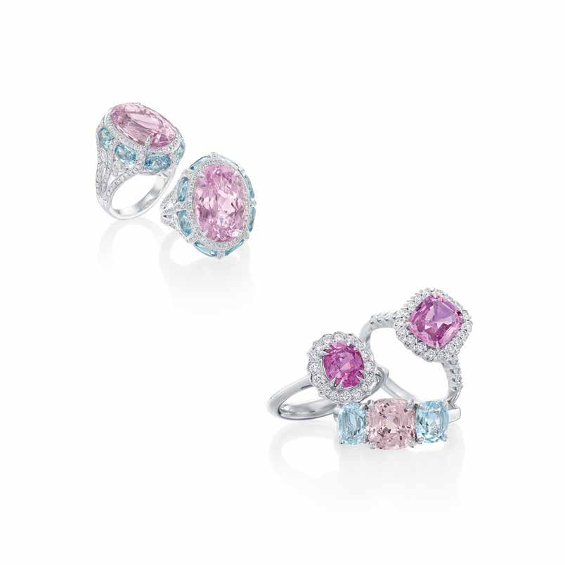 Kunzite, aquamarine and diamond ring, $10,800. Magenta sapphire and diamond ring, $11,500. Pink sapphire and diamond ring, $16,500. Pink spinel and aquamarine three-stone ring, $6,500.