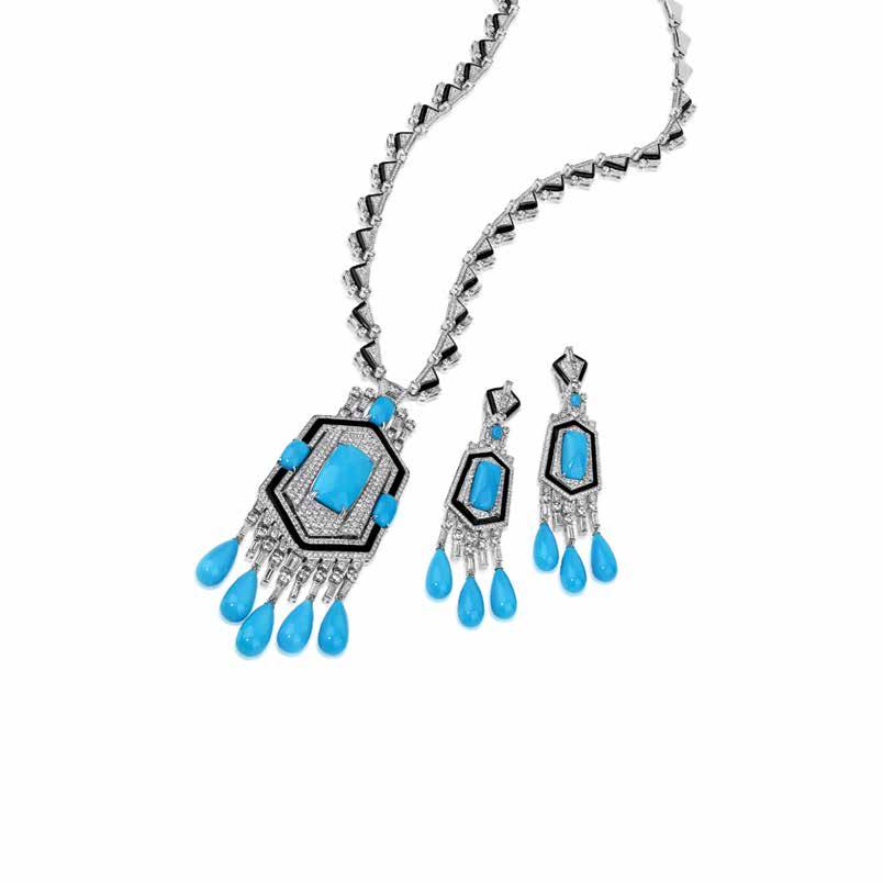 Fine quality “Sleeping Beauty” turquoise, diamond, and black onyx necklace, $72,000, and matching earrings, $23,500.