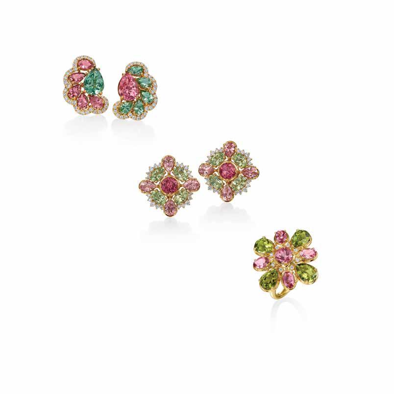 Multi-colored tourmaline and diamond earrings, $7,075 and $6,800. Ring, $5,400.