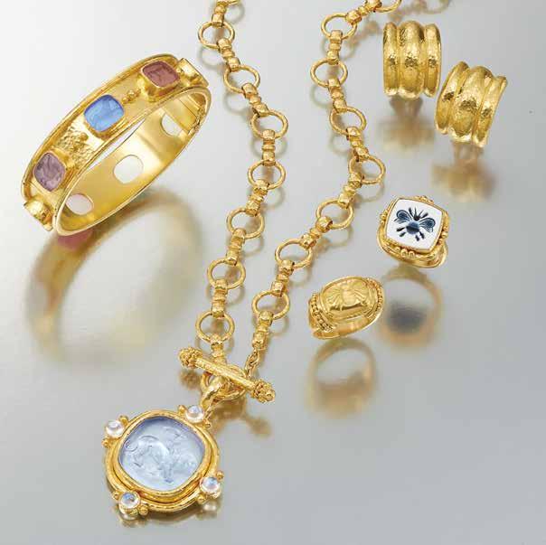 Bangle bracelet with pastel Venetian glass intaglios, $15,900. “Celtic” chain, $14,000, with detachable “Cupid Riding Lion” intaglio pendant in Venetian Glass with moonstone accents,$6,200.