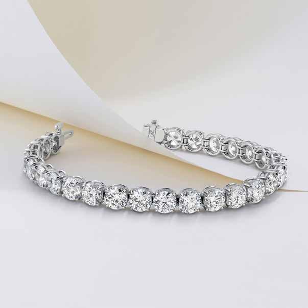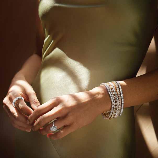 Three carat diamond ring, $44,000. Stack of diamond line bracelets in a variety of styles and prices.