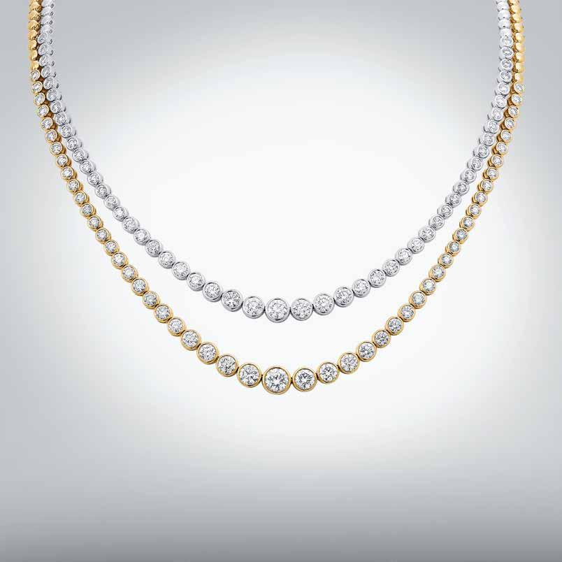 Bezel set diamond necklaces, in white and yellow gold, $24,750 and $27,500.