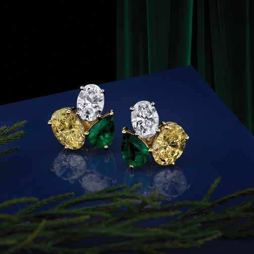 Six carat oval diamond ring, $220,000. Yellow diamond and emerald earrings, $195,000.