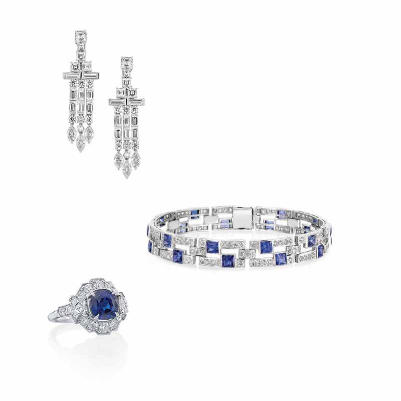 Art Deco style diamond and sapphire bracelet, $55,000. Sapphire and diamond ring designed by Raymond Yard, $38,000.
