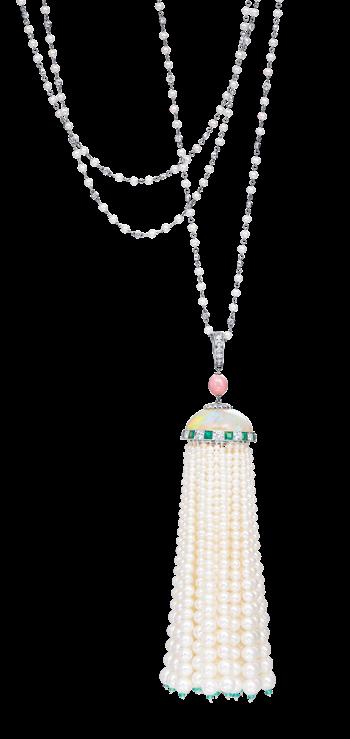 Graduated cultured pearl tassel necklace with an Ethiopian opal top, rare conch pearl, and diamond and emerald accents, $35,000.