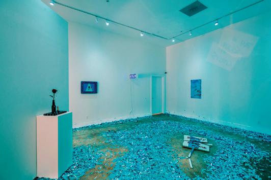 For another moment of con ating the intimate with the political, Parsons created State of Union, a clouded restroom mirror with “for a good time call” scrawled on with bright red lipstick or marker. A phone number when dialled leads to a voice message that could be le for the state or a lover: “I don’t think we want the same things. … I revolt. It’s still love.” Meanwhile, “Don’t Leave Me is Way” plays in the background as if the voice on the phone is lost at Club Rapture, the music blaring.