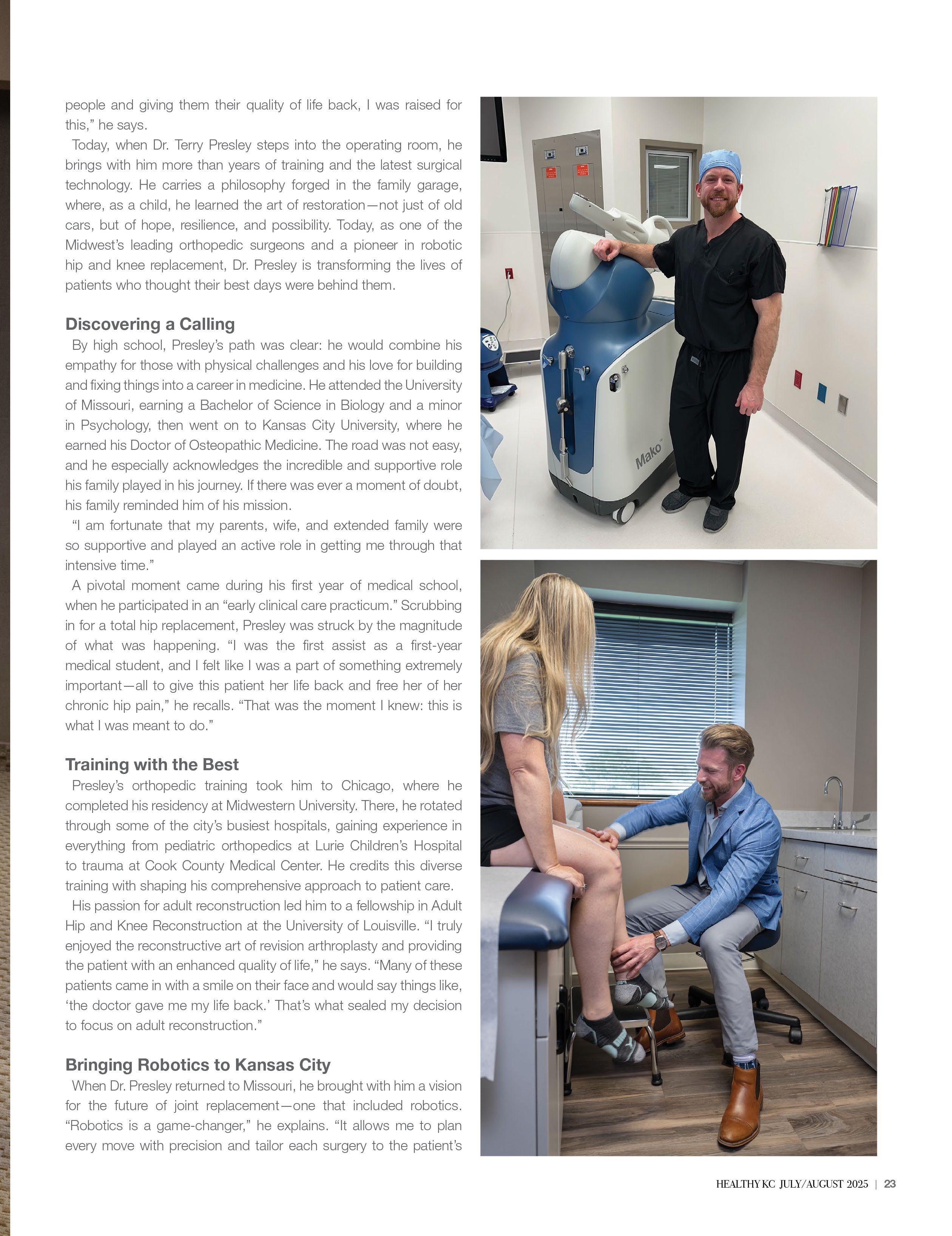 Dr. Presley’s commitment to excellence doesn’t stop at the operating room door. As an Associate Professor of Orthopedics at Kansas City University, he mentors the next generation of surgeons, sharing his passion for innovation and patient-centered care.