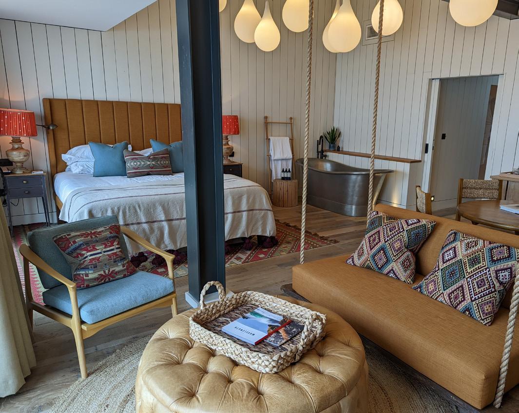 Set back on a road behind Camber Sands, The Gallivant is a chic new beach property with a focus on wellness. An adults-only hotel, it has an eco garden inspired by the dunes out front, with succulents, pines and drought-tolerant shrubs. Daily yoga classes help guests find inner calm, and wellness workshops range from peloton bike sessions to sound baths and wild swimming. Spa treatments are available in a beach cabin [pictured], which makes up for its size with indulgent Bamford products. The best of the 20 bedrooms have oak panelling, such as the Baby Hampton room, private terraces and/or rolltop baths. More than 90 percent of the produce used in the restaurant is local (within 20 miles) and there is an extensive English wine list. Best of all, guests can order hot toddies and fish and chips to eat on the beach.
