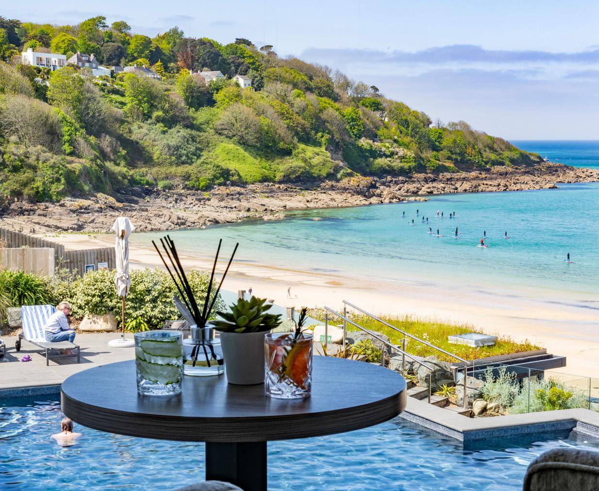 The beach at Carbis Bay, near St Ives, is a sheltered stretch of creamy sand owned by the family run hotel behind it. With a glamorous Bamford spa, four restaurants and lodges that housed world leaders during the G7, the hotel attracts repeat visitors and those seeking a luxurious coastal escape. Beach Lodges are positioned right above the sand, with four or five bedrooms, upmarket kitchens and hot tubs overlooking the waves. Beach Suites are a similarly high standard. The spa’s heated outdoor pool has panoramic views and is somewhere to bathe while spotting seals and dolphins, or watching paddleboarders out in the bay.