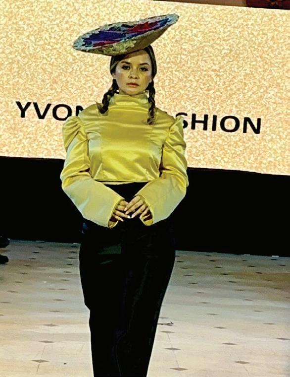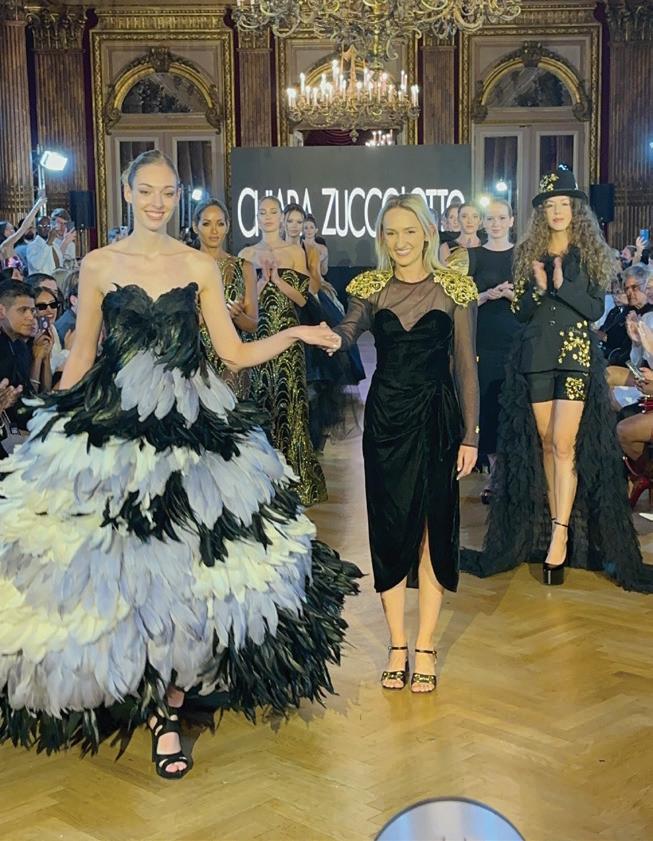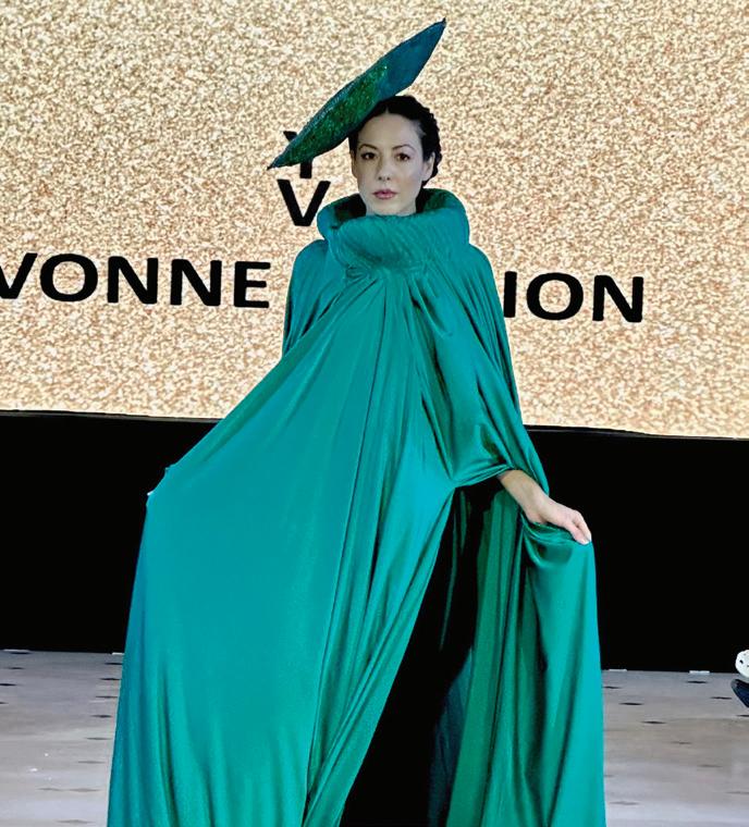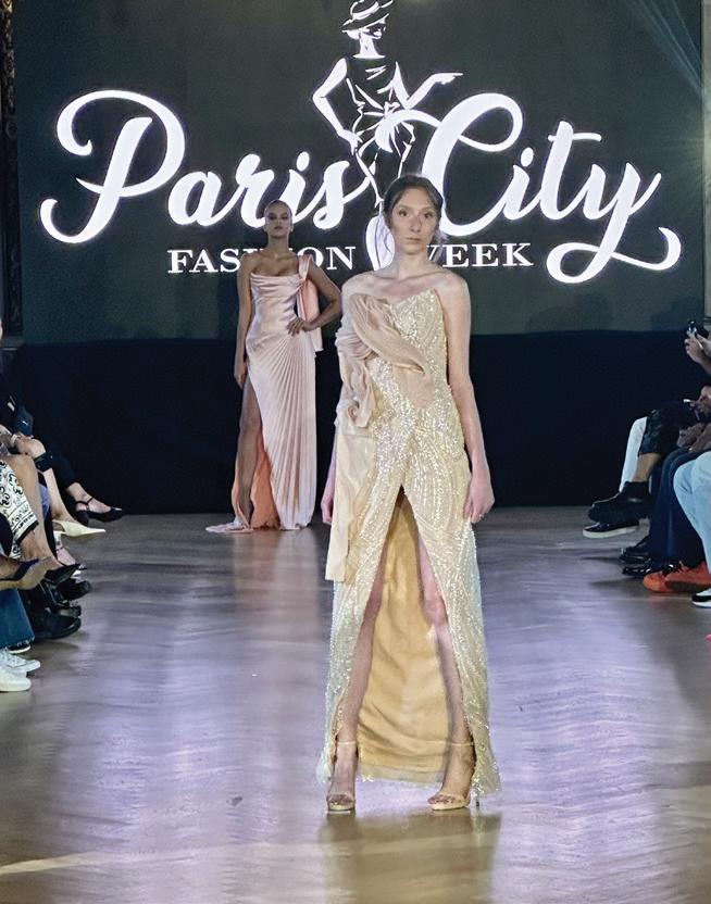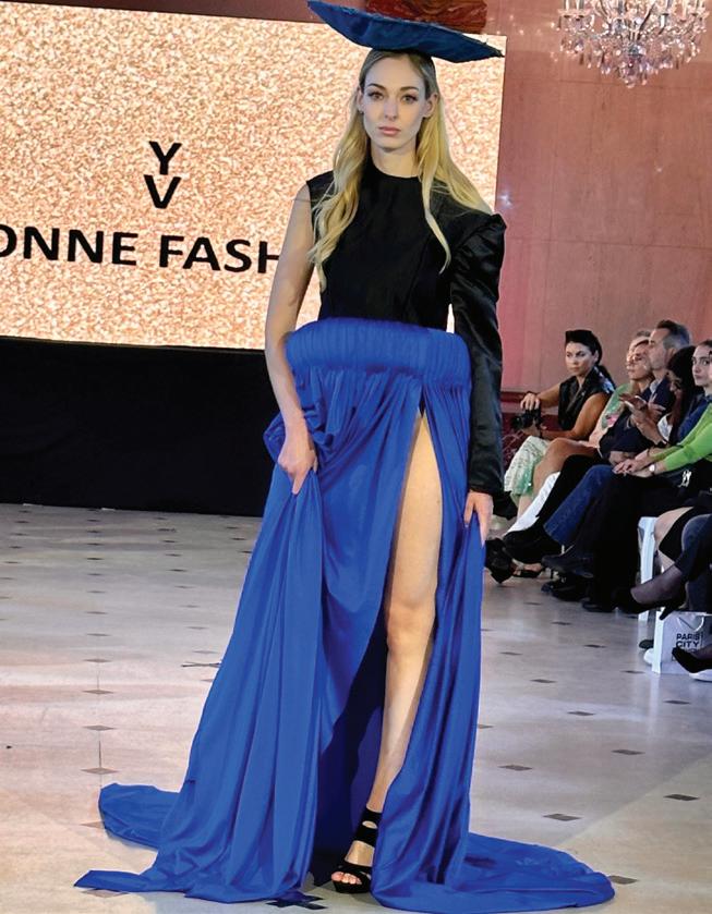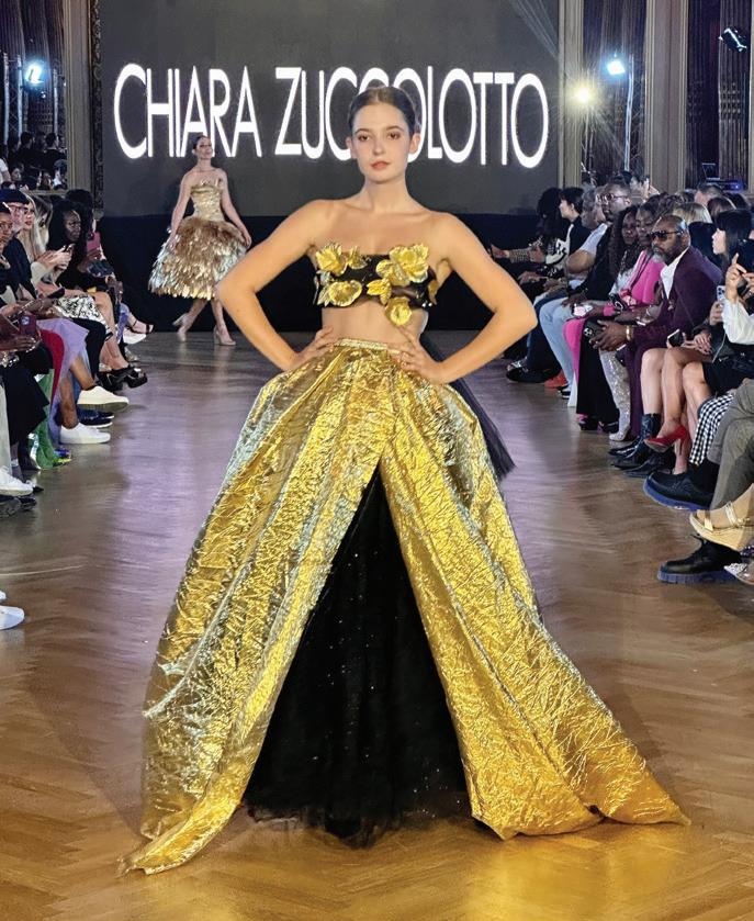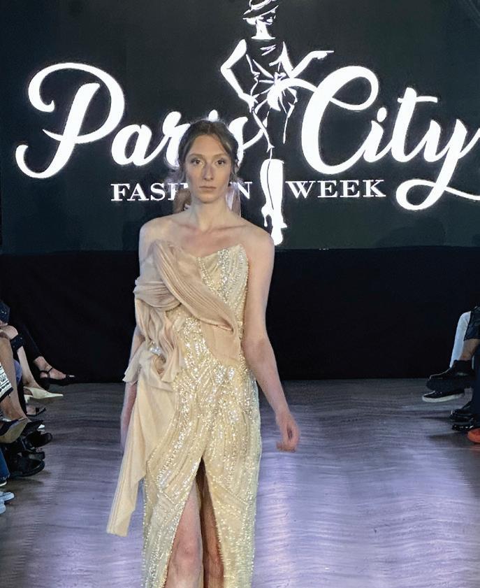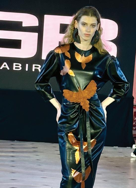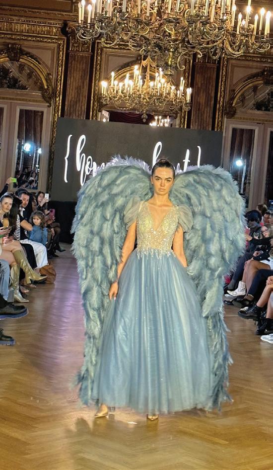 Central to this collection was the concept of recycling the past, symbolised by the incorporation of aged papers that have been transformed into bold statement accessories embellishing these dresses. The designs showcased a sense of asymmetry, with ruffled overthe-shoulder sleeves, and fabrics extending into captivating collars. The visual narrative was woven into each design, using delicate fabric to represent rebirth, with layering techniques and intricate cuts adding an artistic flair to the pieces. The colour selection ranged from serene pastels to deep black, transitioning to the luxurious velvet and silver dresses, and ultimately culminating in a wedding gown that encapsulates the essence of this collection.
