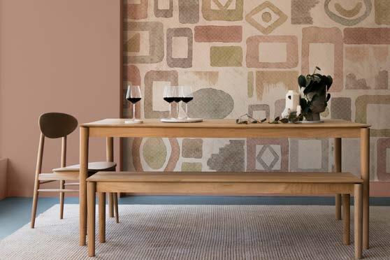 Geometría, trazos y formas se funden con tonos neutros, sutiles degradados y sombras amables originando un movimiento de elementos que fluyen suavemente y bailan sobre el lienzo de tus paredes.