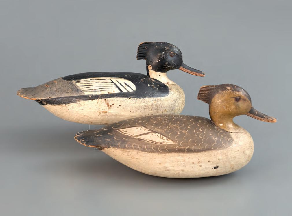 A singular and robust pair of red-breasted mergansers with high-bodied and pegged constructionmadefor the Stavis Collection. The hen is holding a mollusk in her bill.