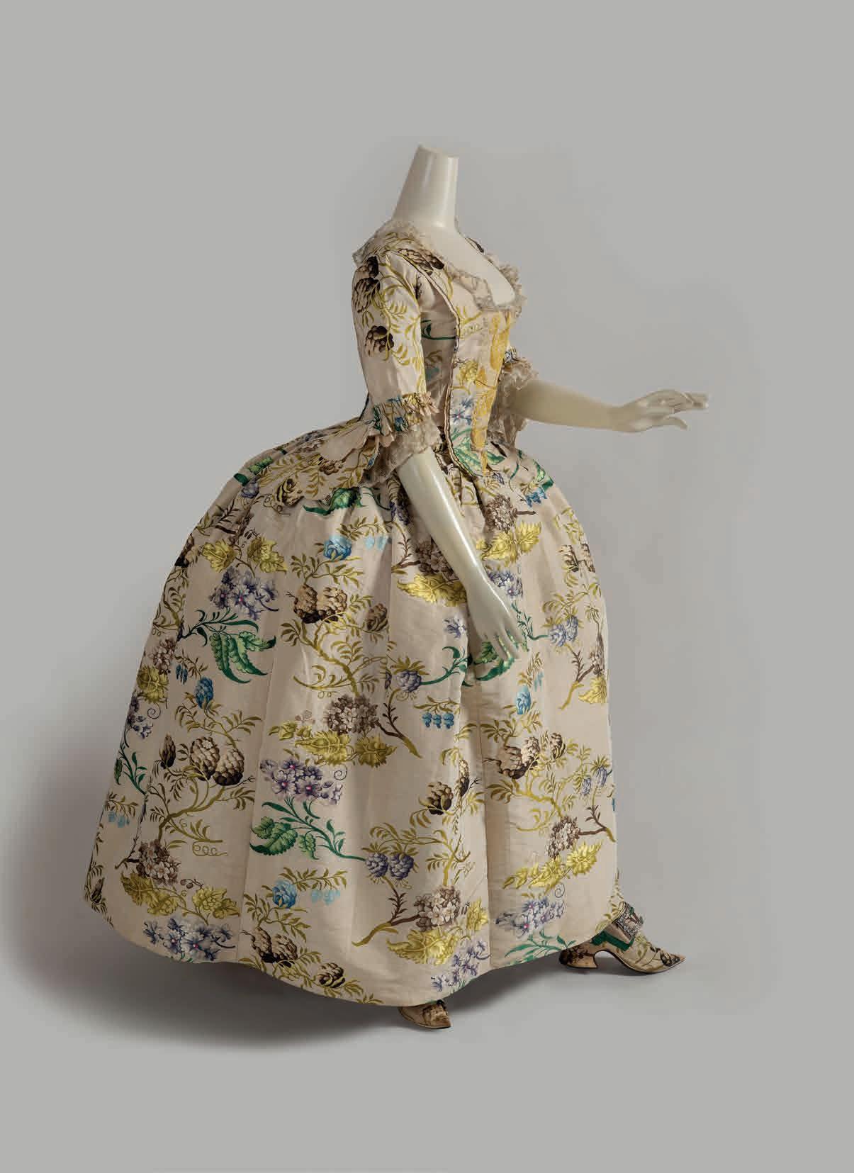 ROUND GOWN OF BROCADED SILK WITH MATCHING SHOES THE SILK POSSIBLY DESIGNED BY ANNA MARIA GARTHWAITE English (Spitalfields), ca. 1750–60, the silk ca. 1742–44