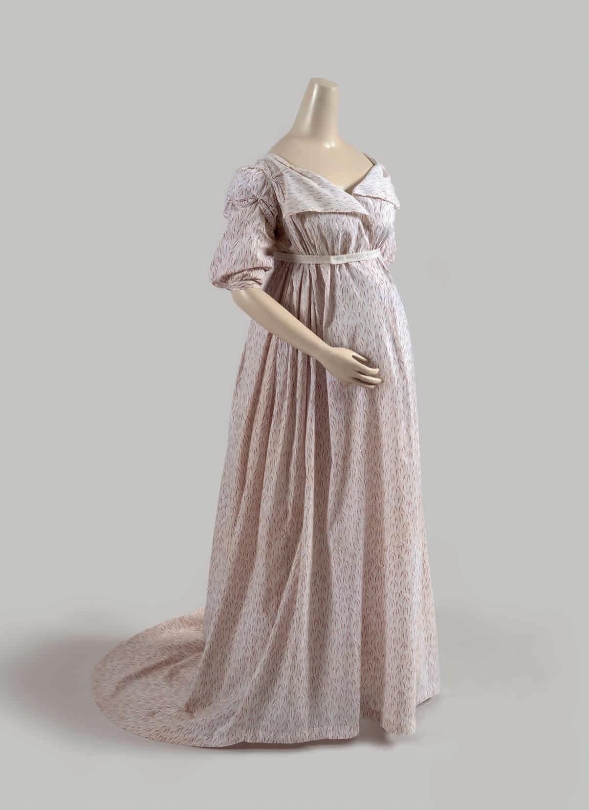 Before the introduction of maternity wear as a distinct category of clothing in the early twentieth century, women modified their existing garments to accommodate their changing bodies for pregnancy and nursing. Worn at a time that was potentially dangerous for both mother and child, maternity clothes were primarily functional and only very rarely saved. The survival of these matching printedcotton dresses that likely belonged to the same woman, one intended for maternity, is remarkable. In contrast to the rigidly corseted, conical shape, and heavy silks fashionable during most of the eighteenth century, the high-waisted cotton gowns in style at the turn of the nineteenth century were considerably more comfortable for expectant women. This pair of dresses tells a moving and important, but often lost, story about the lives of women for whom the expectation of childbirth brought joy and unknown risk.