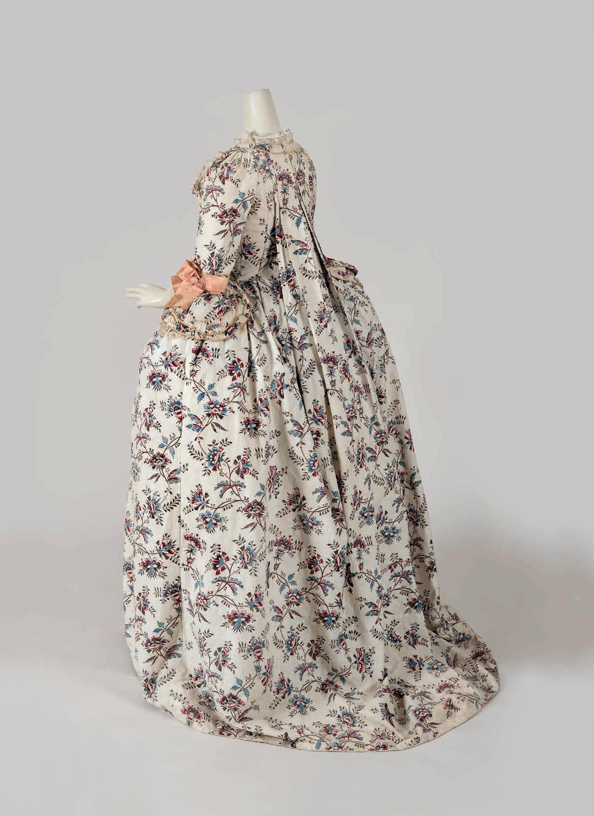 Complete robes à la française of printed-cotton indienne are exceptionally rare. Comparable French examples include those at the Metropolitan Museum of Art (C.I.64.32.3ab) and the Palais Galliera (GAL1920.1.555AB). Despite a tantalizing glimpse of double registration lines indicating the edge of a large chef de pièce across the center back of the petticoat, an identification with any particular textile factory remains elusive, as designs migrated frequently throughout France and across borders, particularly to Switzerland. A caraco of similar printed cotton, attributed to a French manufactory, is illustrated in the 2018 book Indiennes: un tissue révolutionne le monde! Helen Bieri Thomson, cat. no. 18.