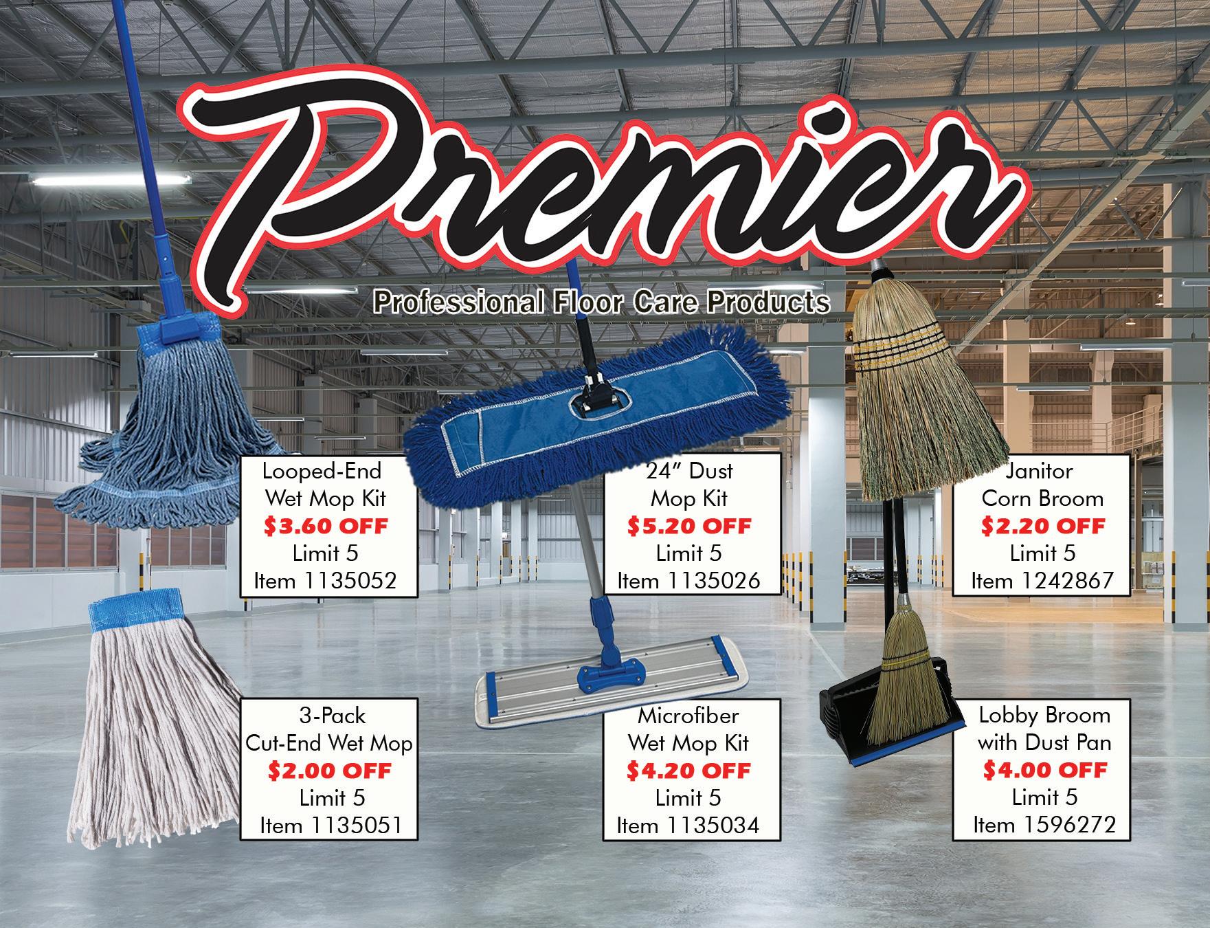 Valid April 1 – 28, 2024 | Item selection may vary by location. 22 SAVE $360 Premier Cotton Wet Mop Kit Looped-End Blue Item 1135052 Limit 5 SAVE $5 Scotch-Brite Grill Scrubbers Heavy Duty 12 ct Item 776340 Limit 5 SAVE $2 Scotch-Brite Scour Pads Heavy Duty 6"L x 9"W 20 ct Item 150423 Limit 5 SAVE $520 Premier Dust Mop Kit with Swivel Handle 24" Frame Blue Item 1135026 Limit 5 SAVE $2 Premier #24 Cotton Wet Mop Refills Disposable 3 ct Item 1135051 Limit 5 SAVE $4 Premier Lobby Corn Broom with Dust Pan Item 1596272 Limit 5 SAVE $420 Premier Microfiber Wet Mop Kit 18" Pad Blue Item 1135034 Limit 5 SAVE $220 Premier Janitor Corn Broom Item 1242867 Limit 5