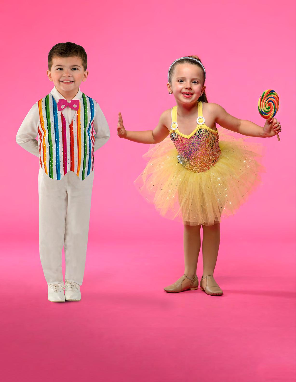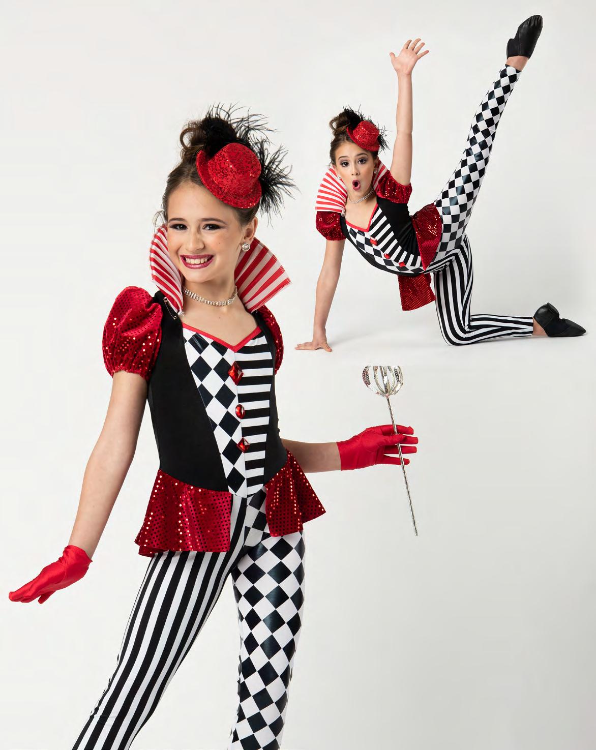 Sequin silky stretch and spandex leotard with front lining and adjustable straps. Attached stretch velvet halter and sash. Attached holodot polka dot skirt over tricot tutu. Rhinestone trim. Imported.