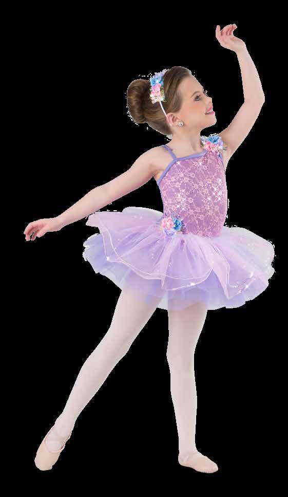 Lavender sequin silky stretch over lavender spandex leotard with adjustable straps. Attached empire waist 3D embroidered top skirt over lavender tricot tutu. Delicate 3D soft appliqué trim. Imported. Flower headpiece included. XSC / LC / XLC / XXLC