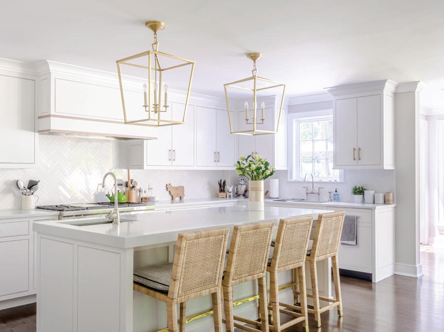 This kitchen by Moss Design includes unexpected touches, like the soft blue Farrow & Ball painted cabinetry paired with a white oak island, bold brass hardware and ebony light fixtures. Updated and sophisticated, this classy kitchen is ready to entertain. mossdesignct. com.