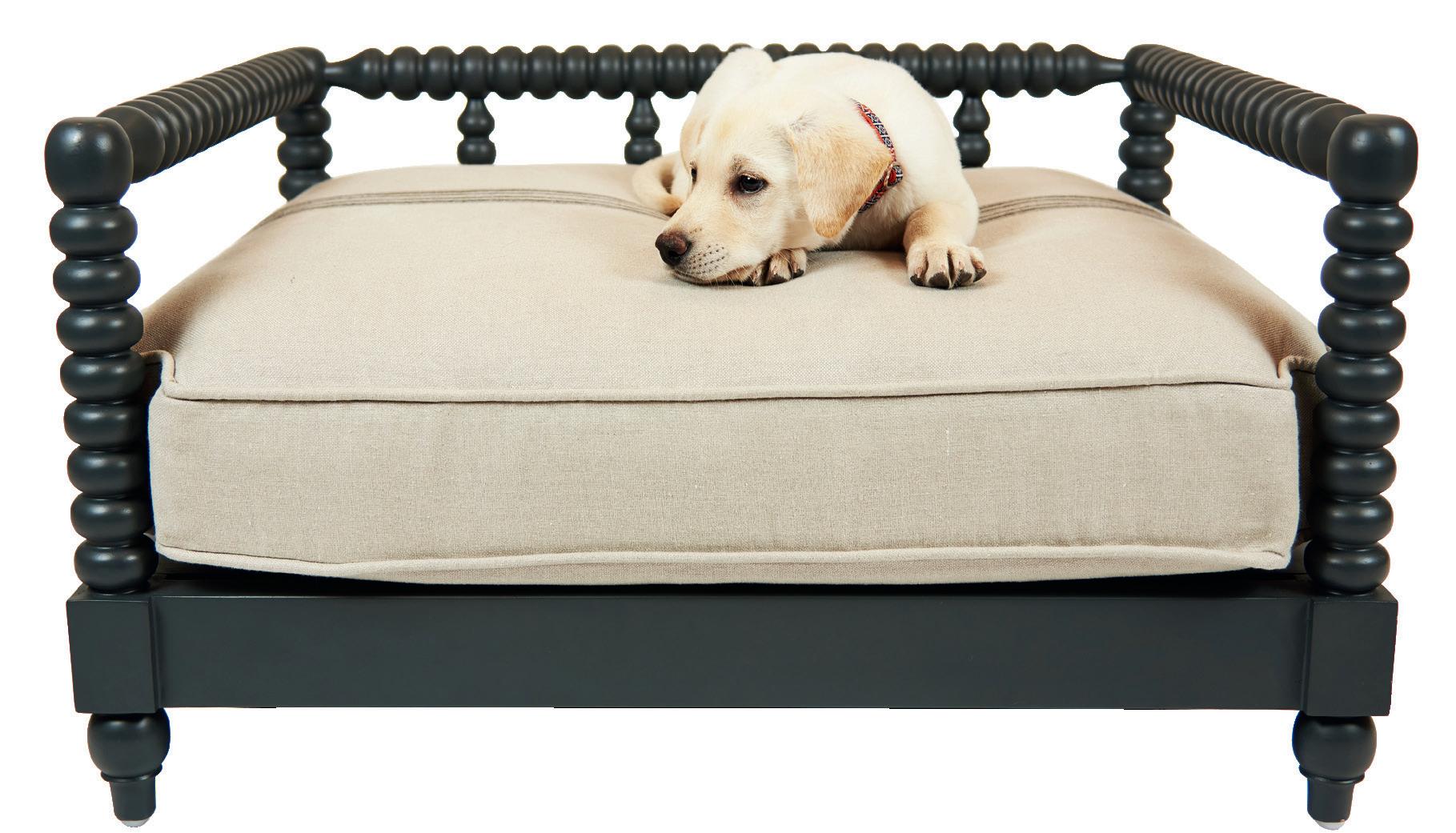 The Mason bed from Greenwichbased Neely’s Nest resembles a classic bobbin chair with stacked ball arms and legs in solid mahogany. Cushion options include a choice of washed linen or performance fabrics. This dog bed is so stylish, you won’t need to hide it away when company comes. $739, neelysnest.com.