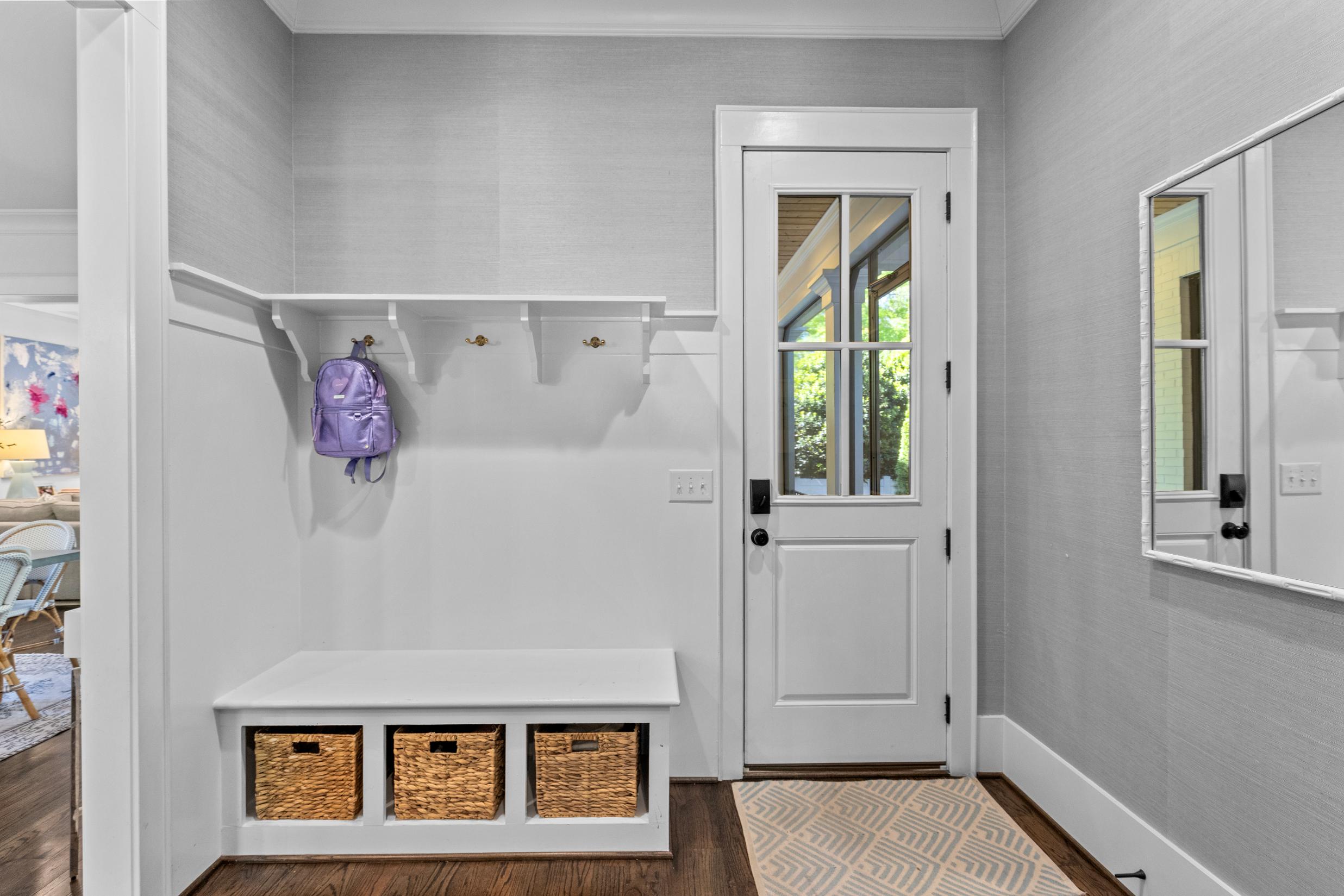 - Mud roomwithrear entry,built-in bench,and grassclothwallpaper