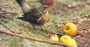 Fieldfares are speckled, grey haired large thrushes that feed on insects, other invertebrates and fruit. They visit the UK in winter to feast on berry laden bushes in hedgerows, woodlands and orchards. Blackbirds are perhaps the most prolific lovers of fallen fruit and many of them will group together to gorge on the softening fruit.