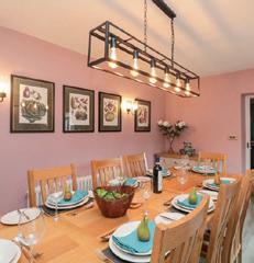 Guests can relax in a living area with an eight person sofa, Ercol dining suite, 50 inch TV and log burner. Sleep spaces are provided in two double bedrooms and a four-person bedroom. Guests share a bath and shower, while rustling up treats is simplicity itself in a kitchen with a Ninja air fryer, Neff oven, Nespresso coffee machine and American-style fridge.
