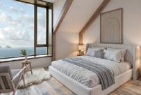 Upstairs are two stylish bedrooms — one with a Juliet balcony and twin beds, the other with a king-size bed and sea views — plus a family bathroom. The top-floor master suite boasts its own sea-facing balcony, king-size bed, coffee machine, mini fridge, en suite, and walk-through mirrored wardrobe.