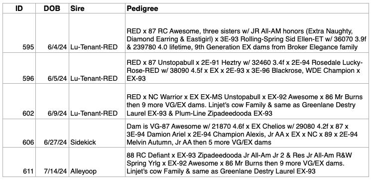 This pertains to choices that are due throughout 2025! In addition there are choices of calves that are already on the ground, but are younger than the standard four months of age.