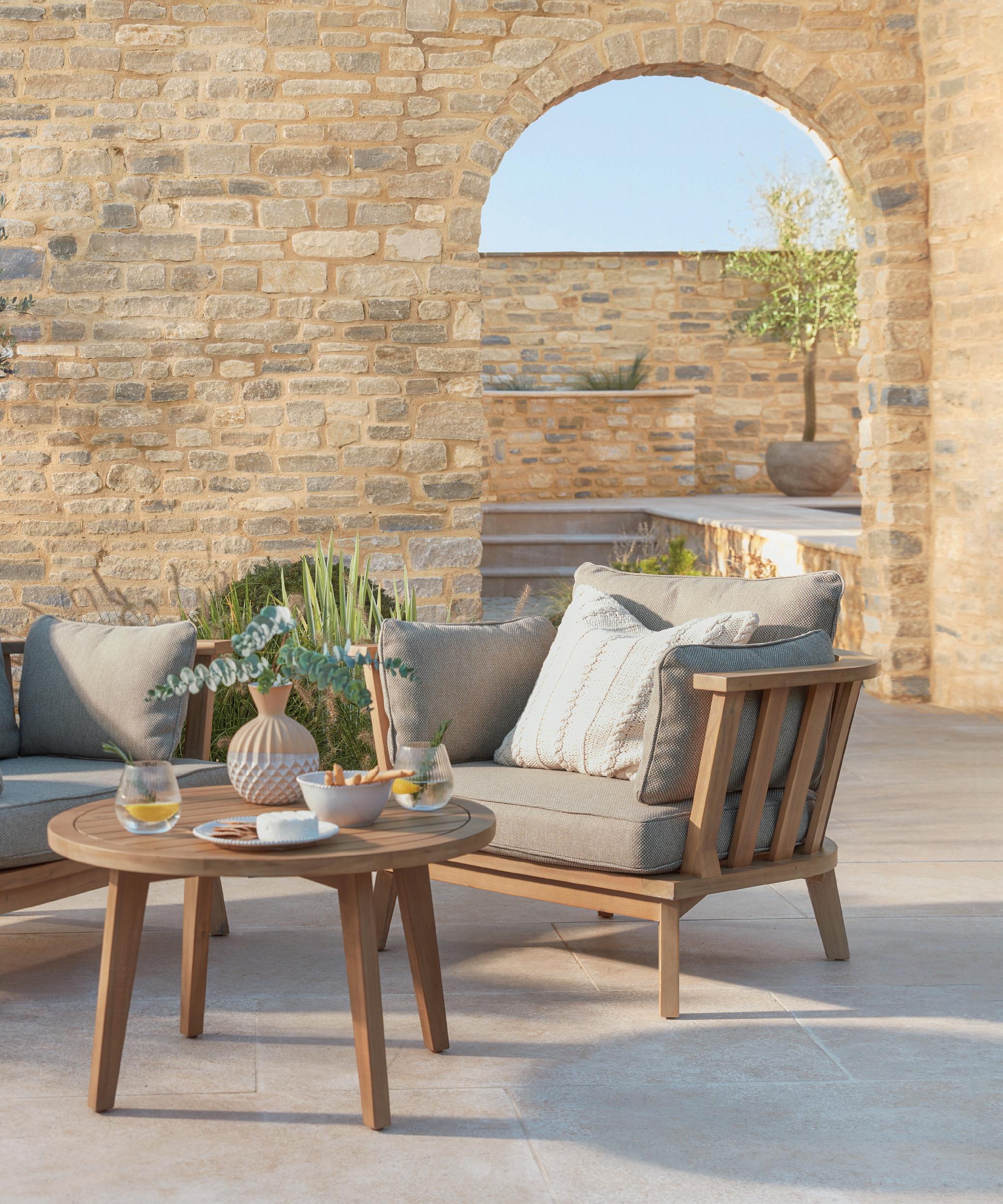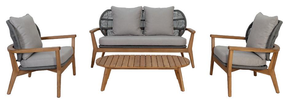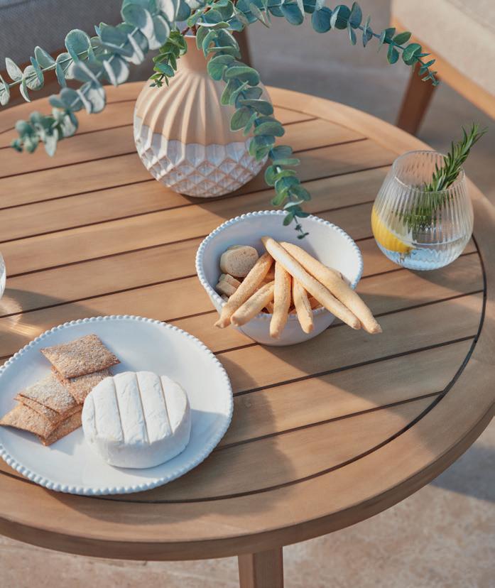 OPPOSITE NEW Round Acacia Dining Table £425 1530159 NEW Two Tove Dining Chairs £495 1534170 THIS PAGE NEW Tove Lounge Set £1,850 1534162 NEW Cable Knitted Cushion £55 1834533 NEW Textured Chevron Vase £65 1134431