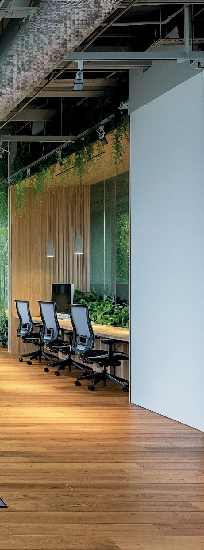 to introduce greenery without occupying scarce floor areas. These vertical elements not only add a touch of nature but also serve as focal points, creating a dynamic and visually appealing atmosphere. They can also work very well as ‘boundaries’ between departmental teams or workspaces, without the formality of a purposely-built solid wall. Additionally, while optimising natural light becomes crucial in smaller spaces, biophilia can be used to create a sense of openness and connect occupants with the outdoors. Using reflective surfaces, mirrors, or light-coloured materials can help bounce natural light throughout the space, to create an illusion of more volume; these can then be used in conjunction with biophilic features (usually adjacent to them, or behind, as a backdrop).