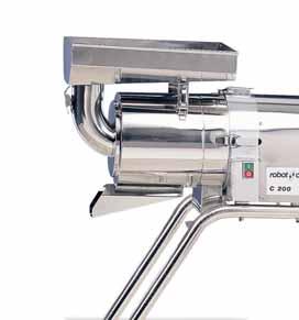 C 200 Special IndustryC 200 V.V. Motor InductionInduction Wattage 1800 W1800 W Voltage 3 phaseSingle phase Speed 1500 rpm100 - 1800 rpm Flow rate 150 kg/hr150 kg/hr Continuous feed Continuous waste ejection Motor base Stainless steelStainless steel Bowl Stainless steelStainless steel