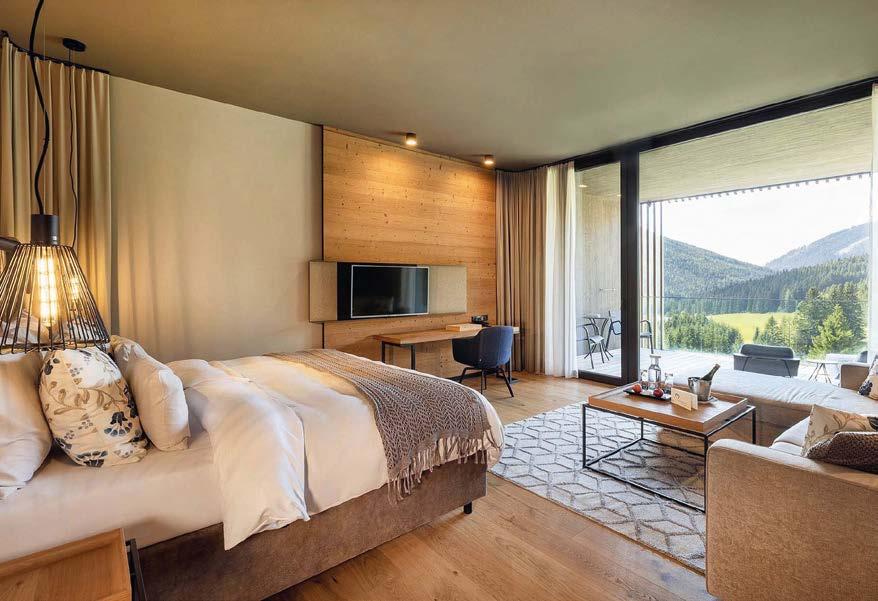 The lovingly furnished rooms and spacious suites offer breathtaking panoramic views and are designed with high-quality natural materials, creating a comfortable and harmonious atmosphere. Luxurious comfort at 1,200 meters above sea level.