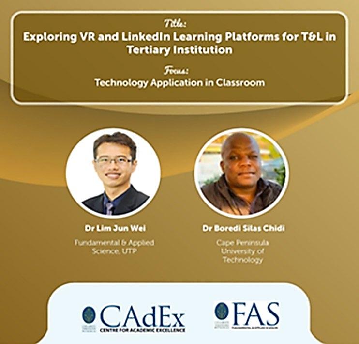 On 24 April 2025, a dynamic knowledge-sharing session brought together Dr. Lim Jun Wei from Universiti Teknologi PETRONAS (UTP), Malaysia, and Dr. Boredi Silas Chidi from the Biotechnology and Consumer Sciences Department at CPUT, to focus on how emerging technologies, particularly Virtual Reality (VR) and the LinkedIn Learning platform, are reshaping teaching and learning (T&L) practices in higher education.